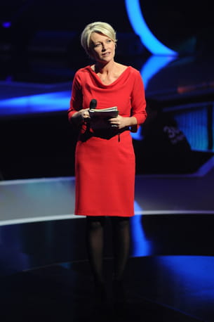 Sophie Davant en robe rouge à la coupe droite et aux manches 3/4, avec des collants opaques et des bottines noires présentant le Téléthon à La Plaine Saint-Denis, le 7 décembre 2013.