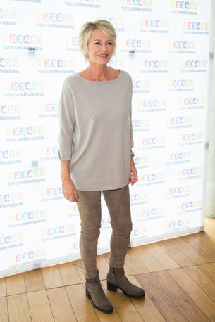 Sophie Davant en total look grège, avec un long pull à manches 3/4, un pantalon skinny et des bottines à la conférence de presse du 30ème Téléthon à France Télévisons, à Paris le 26 octobre 2016.