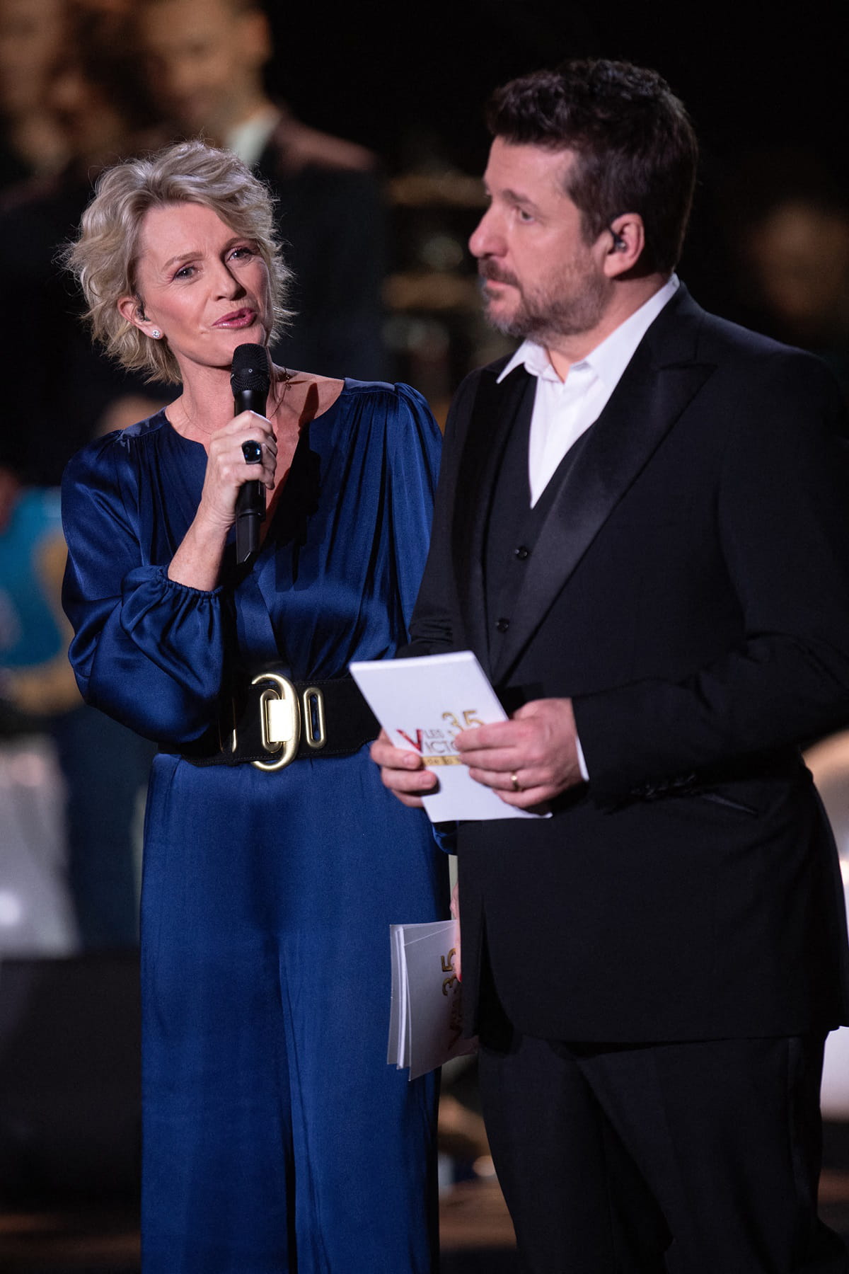 Sophie Davant en combinaison pantalon bleu nuit, au col tunisien et manches bouffantes, avec une large ceinture noire et dorée et des bijoux La Brune et la Blonde à la 35ème cérémonie des Victoires de la Musique le 14 février 2020 à Boulogne-Billancourt.