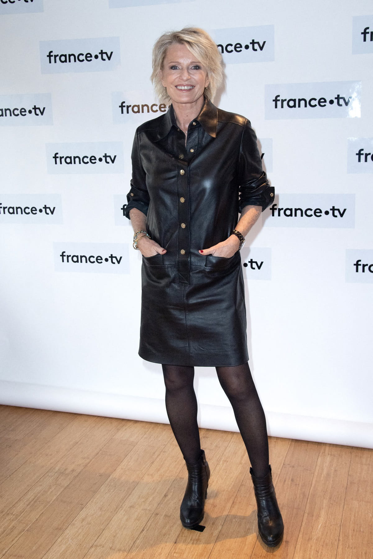 Sophie Davant en robe en cuir noir avec boutons dorés, avec une paire de collants et des bottines à talons lors de la conférence de presse pour le Téléthon à Paris, le 4 novembre 2021.