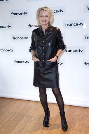 Sophie Davant en robe en cuir noir avec boutons dorés
