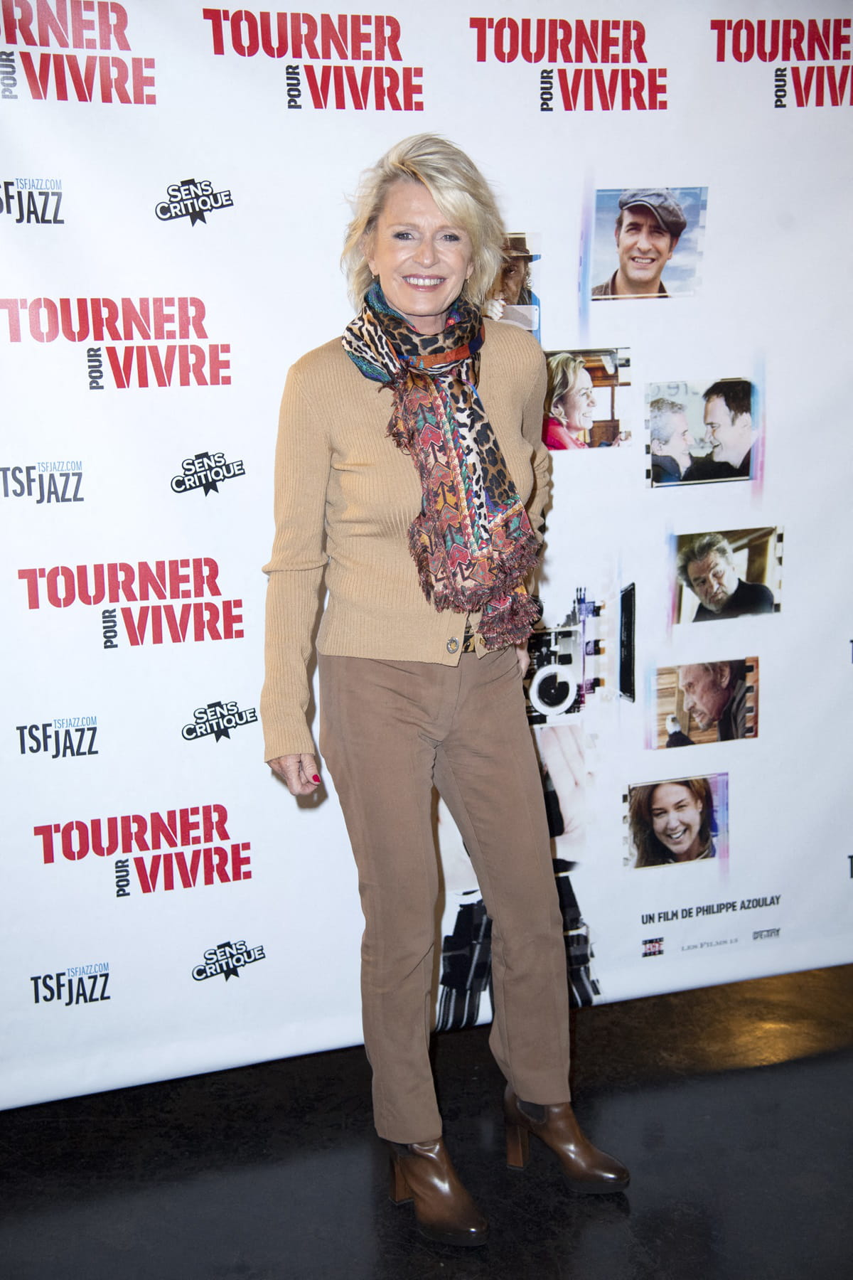 Sophie Davant avec un foulard à motifs multicolores, dans un look mettant à l'honneur un camaïeu de beiges lors de la projection du film documentaire Tourner Pour Vivre à Paris, le 25 avril 2022.