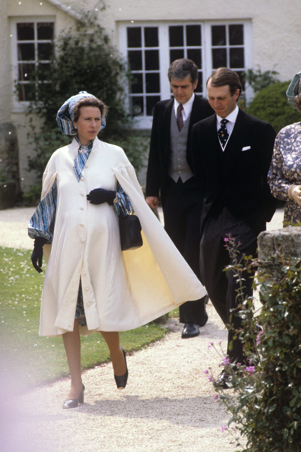 La princesse Anne en manteau cape blanc sur une robe bleue rayée, avec un foulard assorti sur la tête, des gants, un sac et des escarpins noirs à l'église de Great Somerford, Angleterre, en mai 1981.
