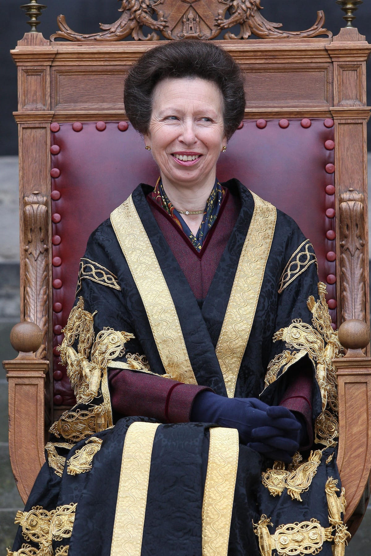 La princesse Anne en cape noire et dorée sur une robe aubergine pour inaugurer son titre de chancelier à l'université d'Edimbourg, en Ecosse, le 26 septembre 2011.