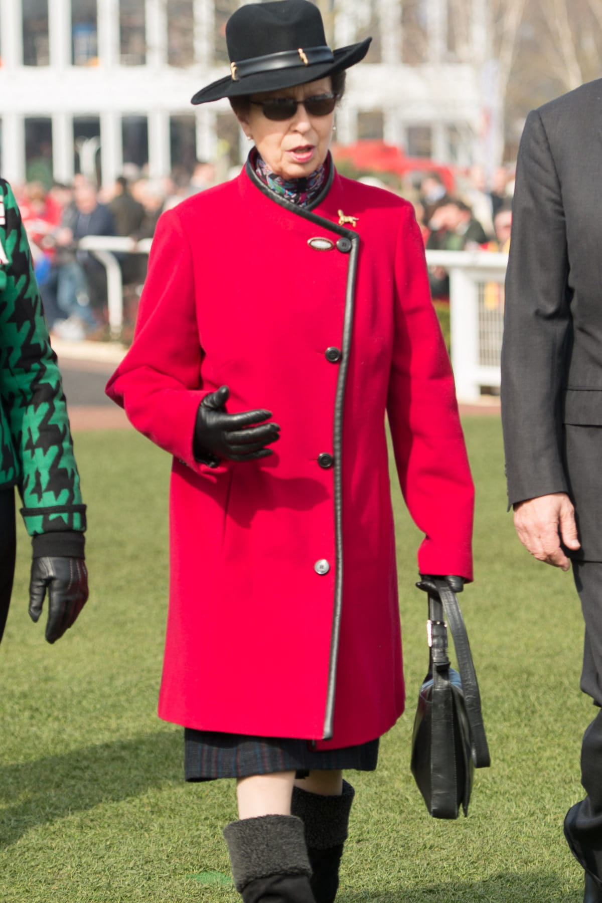 La princesse Anne en manteau rouge vif au liseré noir, bottes à fourrure, avec un chapeau, des gants et un sac noirs à la course hippique Gold Cup Day à Chestelham, Angleterre, le 14 mars 2014.