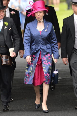 La princesse Anne avec un chapeau rose XXL, accordé à sa robe mi-longue surmontée d'un manteau bleu satiné et fleuri à l'Hippodrome d'Ascot dans le Berkshire en Angleterre le 19 juin 2014.