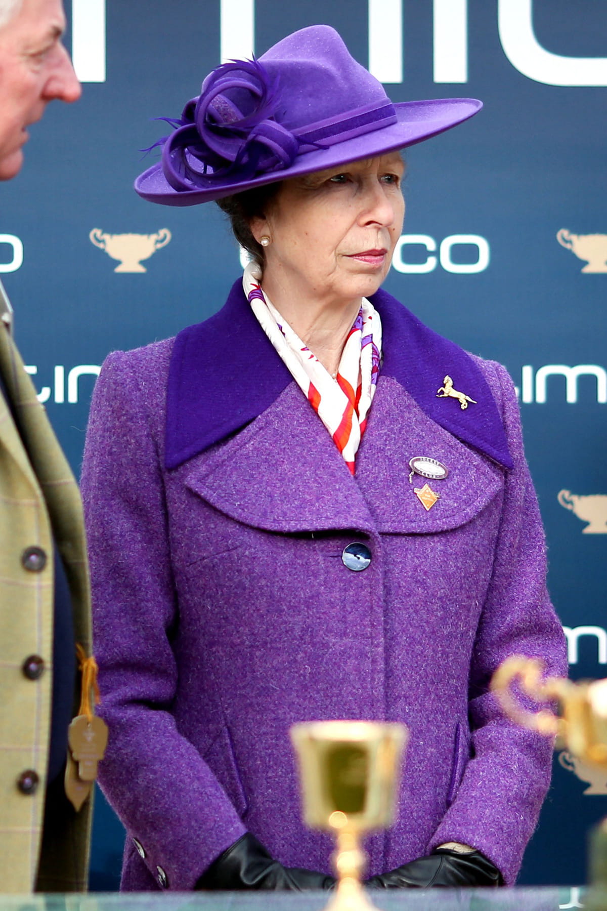 La princesse Anne en total look violet avec un manteau orné de broches, un foulard et un chapeau en feutre lors de la course hippique Gold Cup Day à Cheltenham en Angleterre le 16 mars 2018.