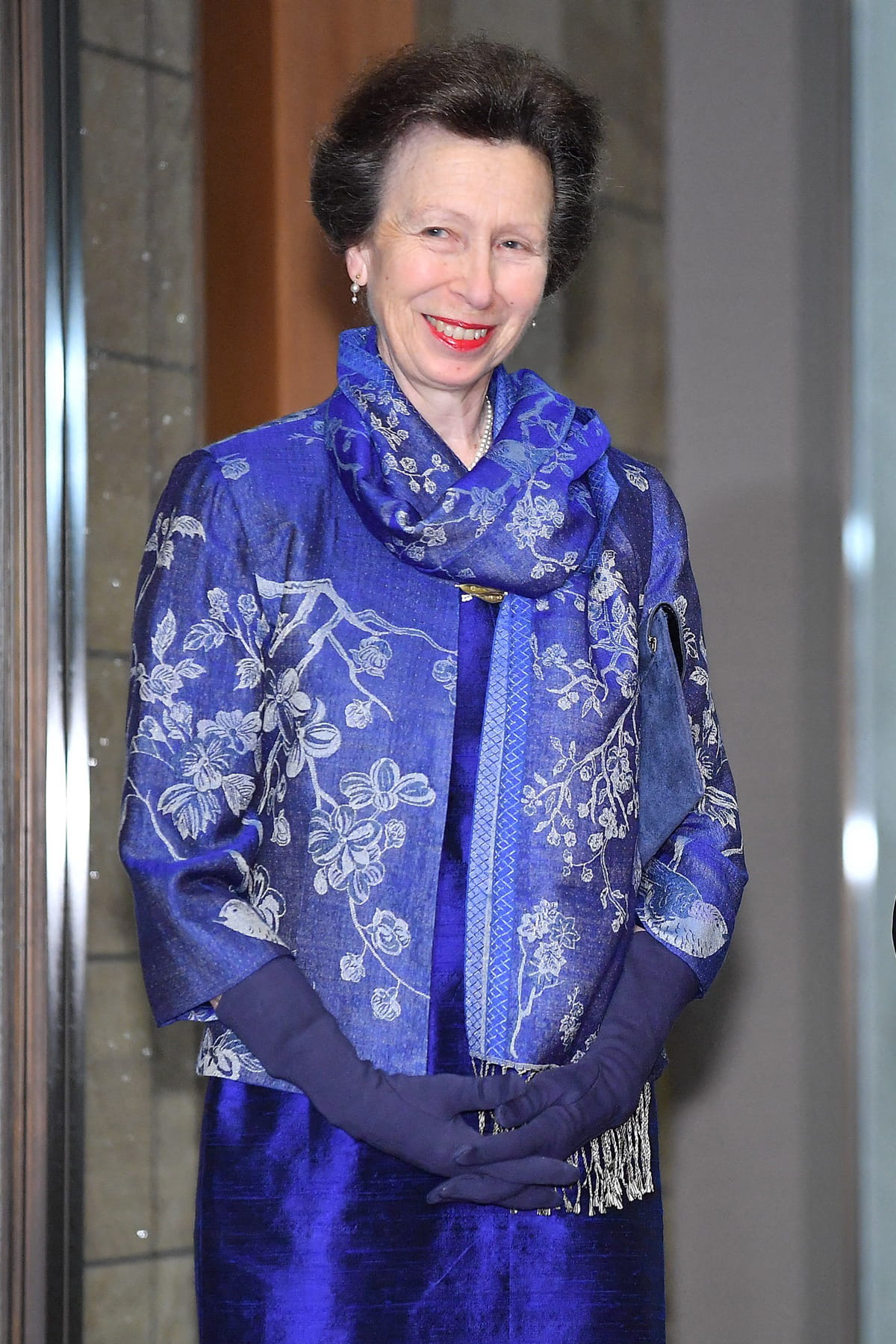 La princesse Anne en total look bleu avec une veste et un foulard fleuris assortis, des gants et une robe satinée au Palais d'Akasaka de Tokyo, Japon, le 11 octobre 2019.