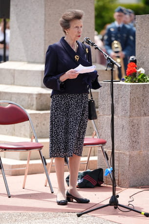 La princesse Anne en veste croisée bleu nuit, jupe mi-longue fleurie, escarpins à petites talons carrés et sac noir lors d'un événement marquant le 80e anniversaire du Débarquement en Normandie, le 5 juin 2024.
