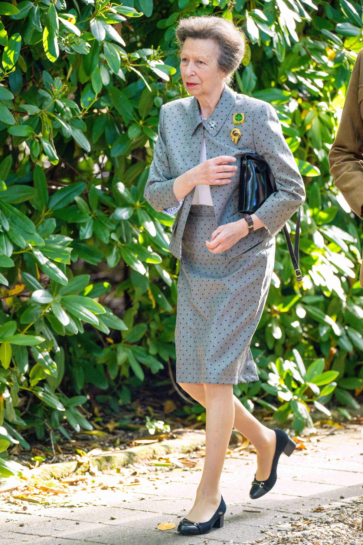 La princesse Anne en ensemble gris à pois, avec une jupe crayon et une veste aux manches 3/4, accompagné d'un sac et d'escarpins à petits talons carrés à Oosterbeek, aux Pays-Bas, le 22 septembre 2024.