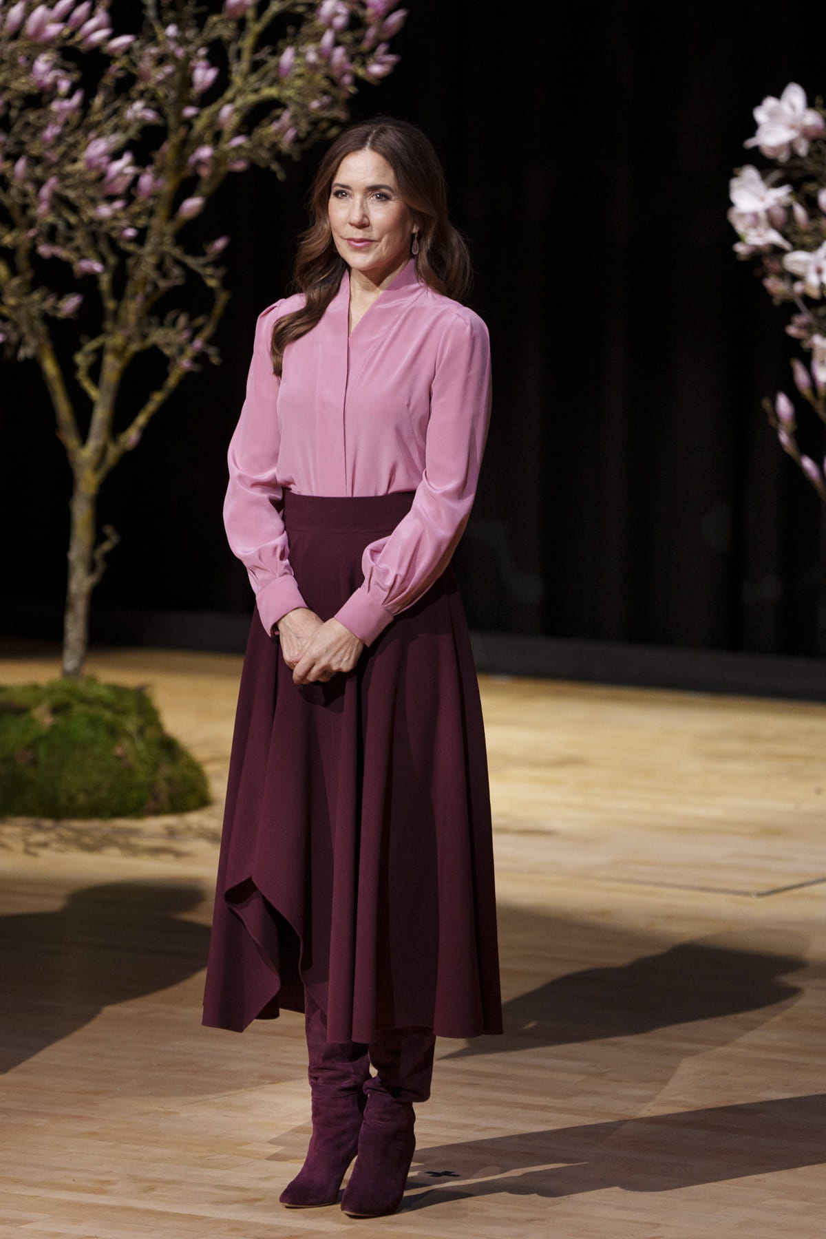 Mary de Danemark en jupe mi-longue en crêpe cannelé bordeaux Alexander McQueen, bottes à talons en suède Aquazzura et blouse rose The Fold à la bibliothèque nationale du Danemark, le 25 février 2025.