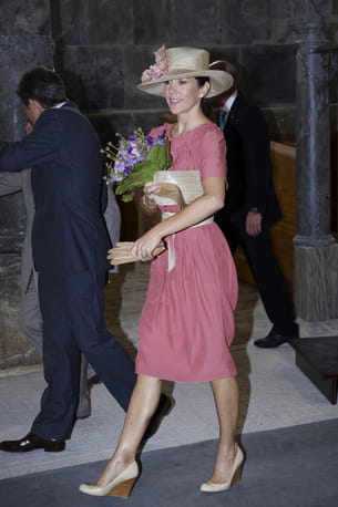 Mary de Danemark en robe rose en soie avec détails à volants et plis sur le devant de Marni, avec un chapeau fleuri et des escarpins à talons compensés au Château de Christiansborg à Copenhague le 18 septembre 2009.