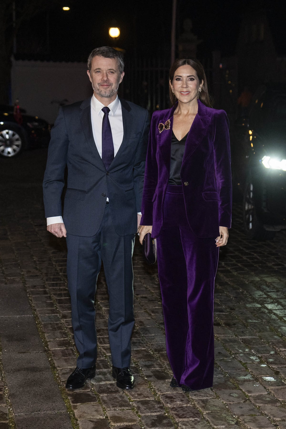 Mary de Danemark en ensemble velours violine de Temperley London composé d'un pantalon droit et de sa veste assortie, avec une minaudière et des escarpins à Klampenborg le 7 décembre 2024 pour un événement organisé par le Président d'Egypte.