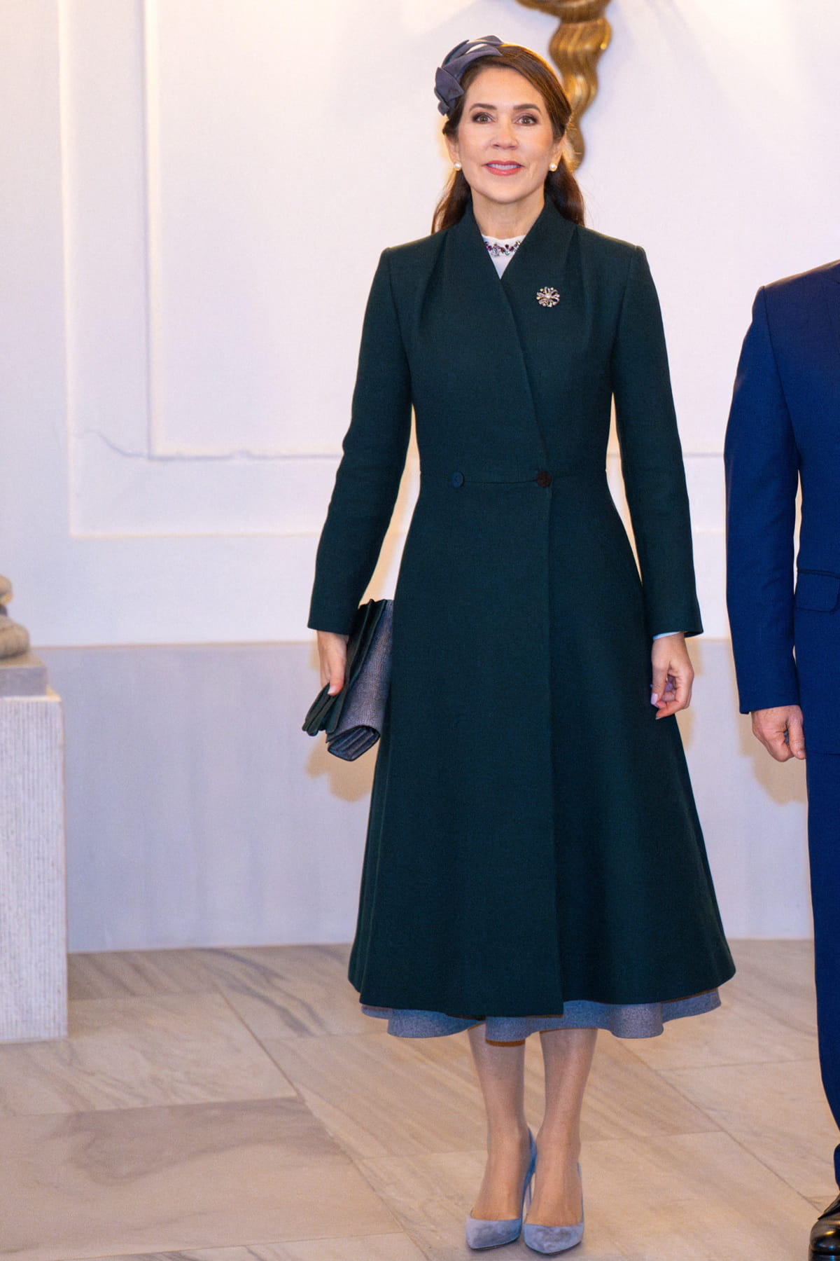 Mary de Danemark avec un bandeau gris en feutre avec feuilles de Susanne Juul, un manteau vert fôret de The Fold, des escarpins pointus et un sac à main au Palais d'Amalienborg de Copenhague le 6 décembre 2024.