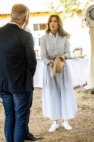 Mary de Danemark en robe chemise rayée bleu clair de Stella Jean, avec une ceinture tressée, des baskets Stan Smith d'Adidas et un chapeau de Canopy Bay à l'Entreprise Brésilienne de Recherche Agricole, à Brasilia le 4 octobre 2024.