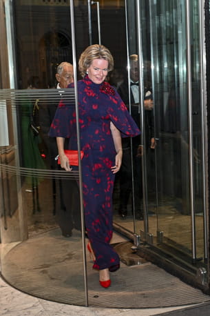 Mathilde de Belgique en robe bleu marine imprimé floral rouge