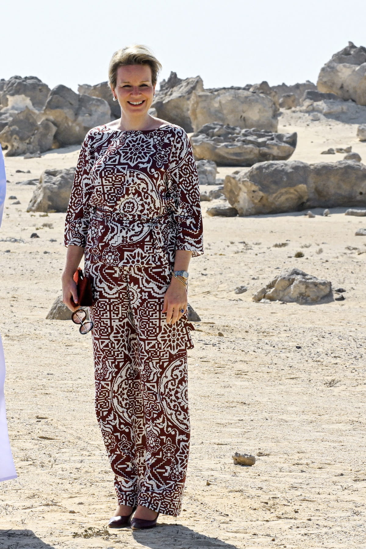 Mathilde de Belgique en ensemble coordonné rouge foncé imprimé de Natan composé d'un pantalon fluide et d'un top à col bateau, avec des lunettes de soleil Longchamp et une montre Rolex lors d'une visite officielle à Oman le 4 février 2022.