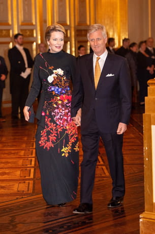 Mathilde de Belgique en robe noire à imprimé floral de Dries Van Noten avec un col cheminée et un drapé à la taille, accompagnée d'une pochette assortie lors du concert de Noël au Palais Royal de Bruxelles le 18 décembre 2019.