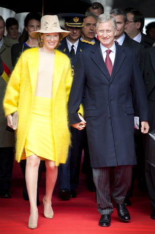 Mathilde de Belgique en manteau jaune vif de Veronique Branquinho avec une jupe assortie, un top et des escarpins beiges ainsi qu'un chapeau à nœud de Fabienne Delvigne à Liège, le 11 octobre 2013.