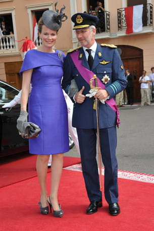 Mathilde de Belgique en robe fourreau violette Armani Privé, avec des escarpins à nœuds et une pochette de la même marque, agrémentée d'un bibi gris au mariage du Prince Albert II et de Charlene de Monaco le 2 juillet 2011.