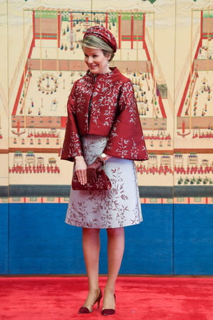 Mathilde de Belgique en veste rouge à motif gris perle