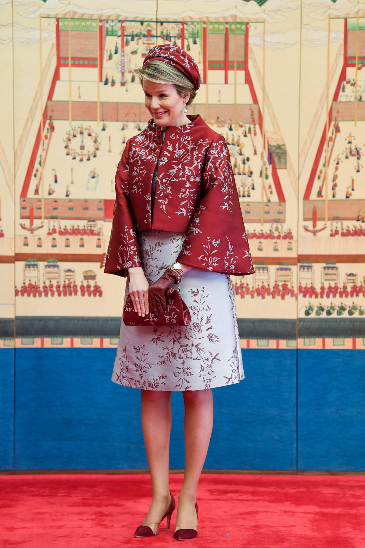 Mathilde de Belgique en veste rouge à motif gris perle aux manches kimono de Natan avec un bandeau et une pochette coordonnés, une robe aux couleurs inversées, des escarpins et des gants rouges foncés le 26 mars 2019 en visite à Séoul en Corée du Sud.
