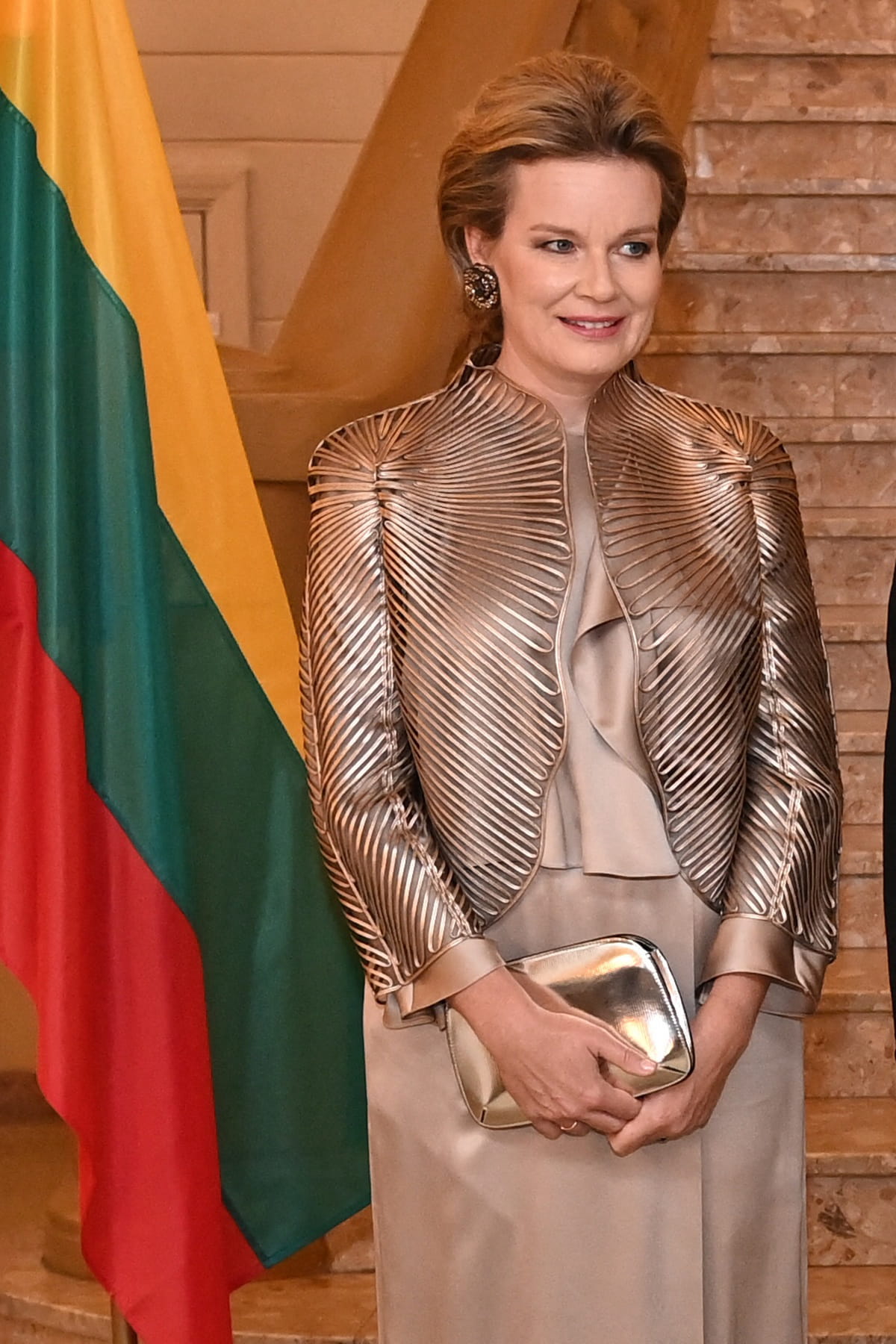 Mathilde de Belgique en veste dorée sur une robe portefeuille mi-longue drapée et une pochette assortie, le tout signé Giorgio Armani, en visite en Lituanie le 25 octobre 2022.