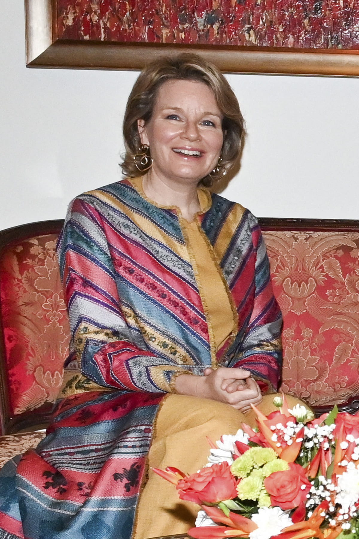 Mathilde de Belgique en manteau coloré en soie imprimée et brodée