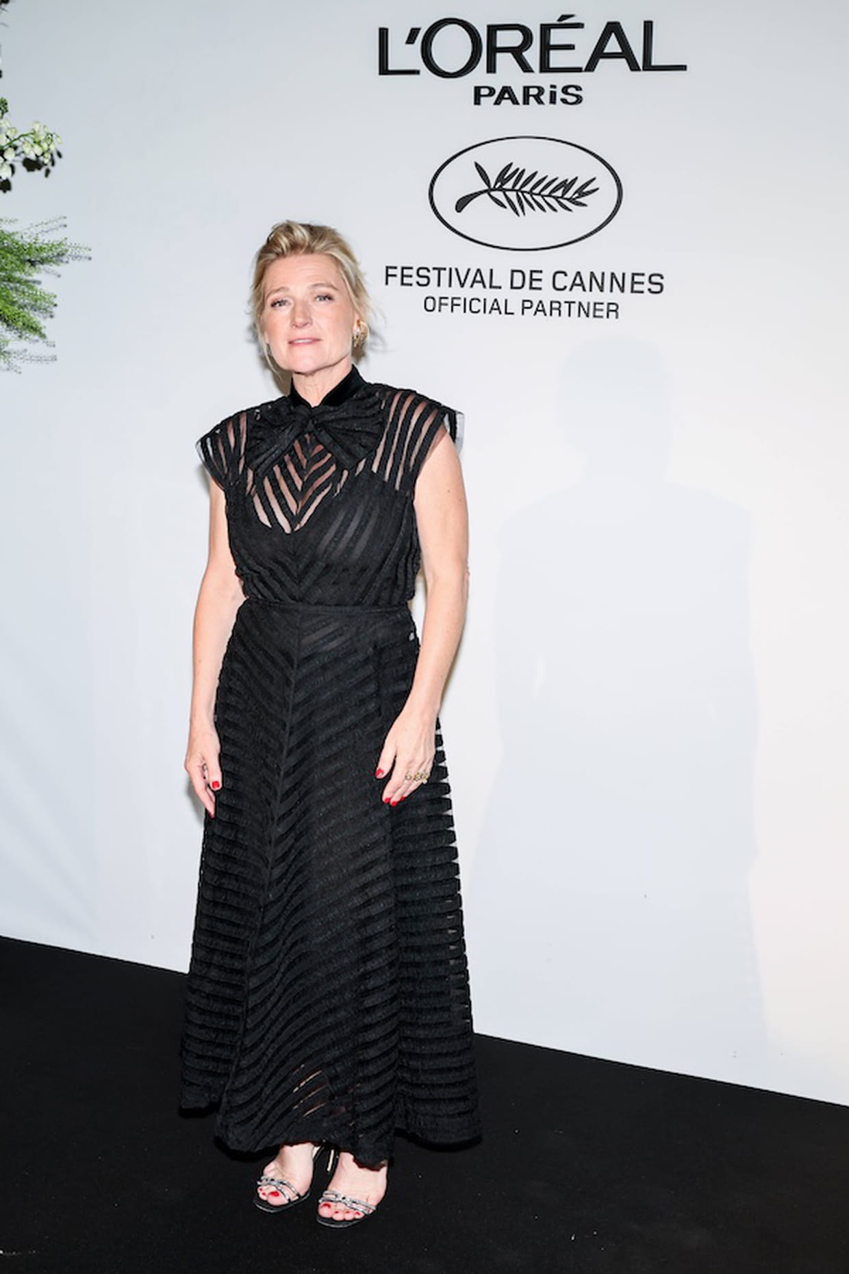 Anne-Elisabeth Lemoine en robe semi-transparente et nœud papillon au dîner l'Oréal "Women of Worth" lors du festival de Cannes le 14 mai 2025.