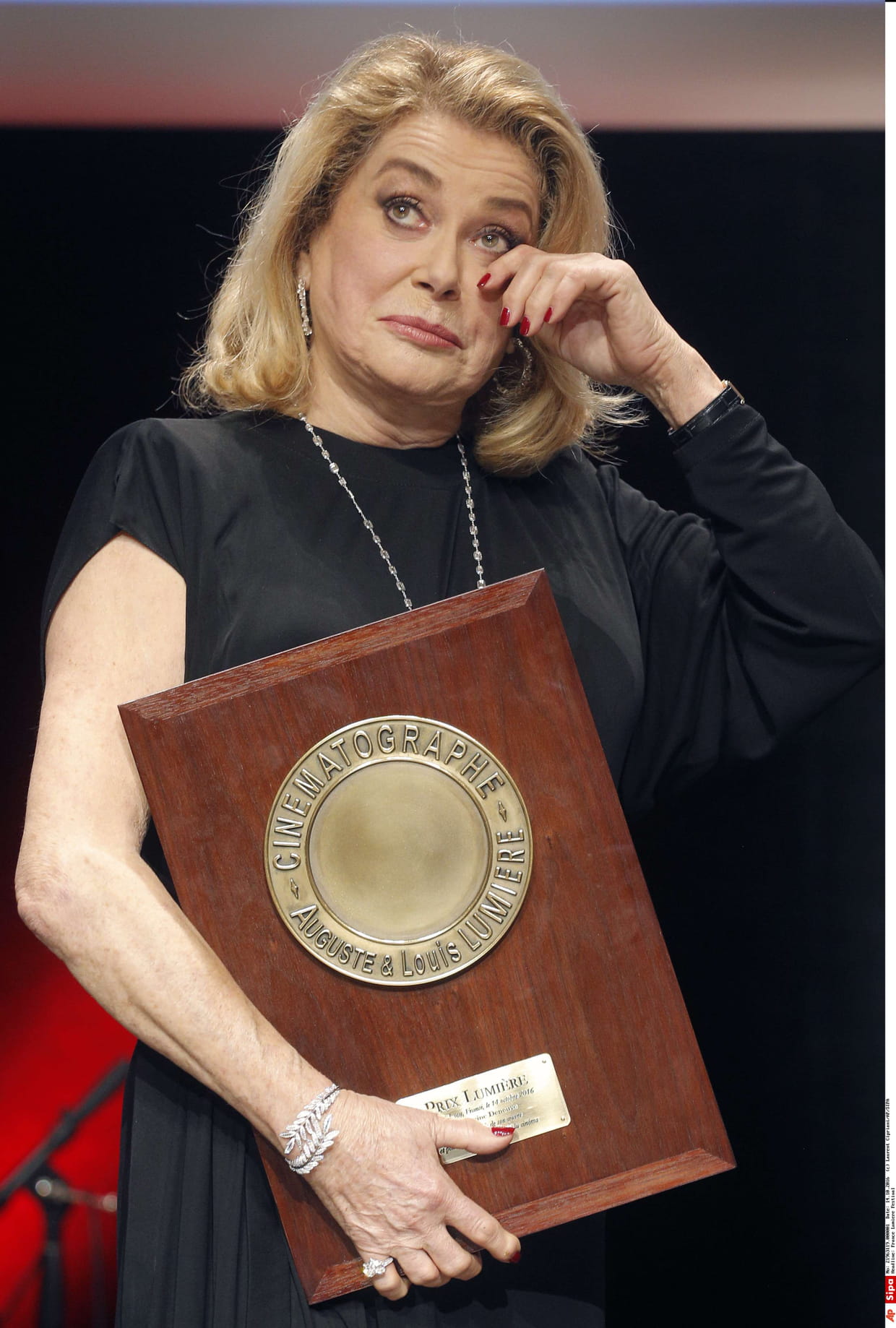 Catherine Deneuve, émue aux larmes, après avoir reçu des mains de Roman Polanski le prix Lumière, qu'elle a dédié aux agriculteurs de France.