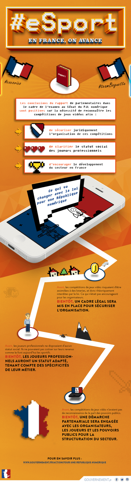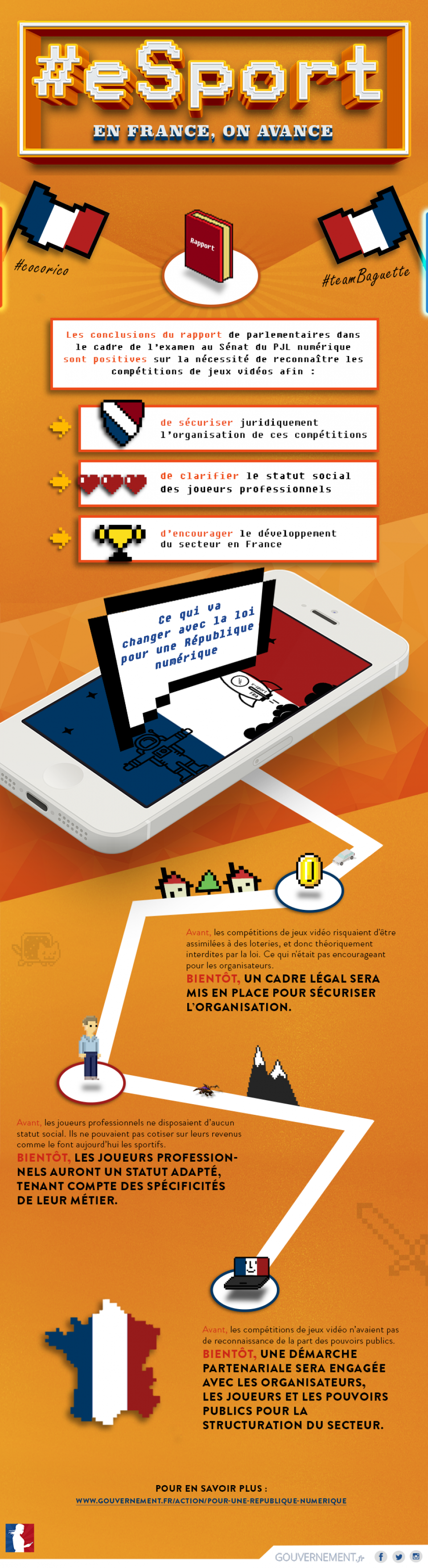 Au mois de janvier, Manuel Valls avait demandé un rapport portant sur le développement des compétitions professionnelles de jeux vidéo, une activité en plein essor, aussi bien dans l'Hexagone qu'au niveau international. Les conclusions, positives, ont abouti à une proposition de loi pour une République numérique. Une infographie traitant de ce sujet a été diffusée fin mars sur le site du gouvernement. À quand un tournoi de Minecraft ou FIFA diffusé à la télévision ?