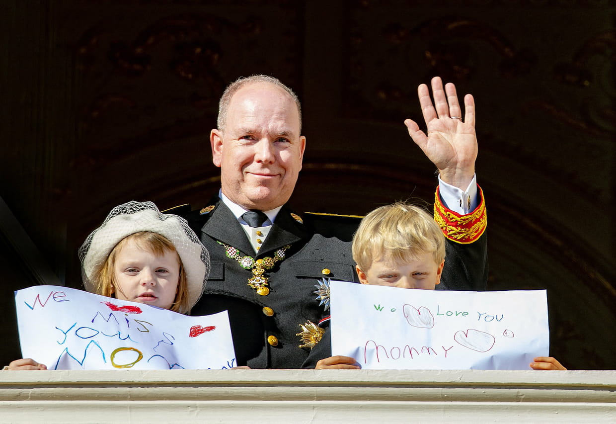Photo : Sur le balcon, Gabriella de Monaco tient une pancarte sur laquelle il est écrit : "Tu nous manques maman". Quant à son frère jumeau, il tient une feuille où il est écrit "On t'aime maman".