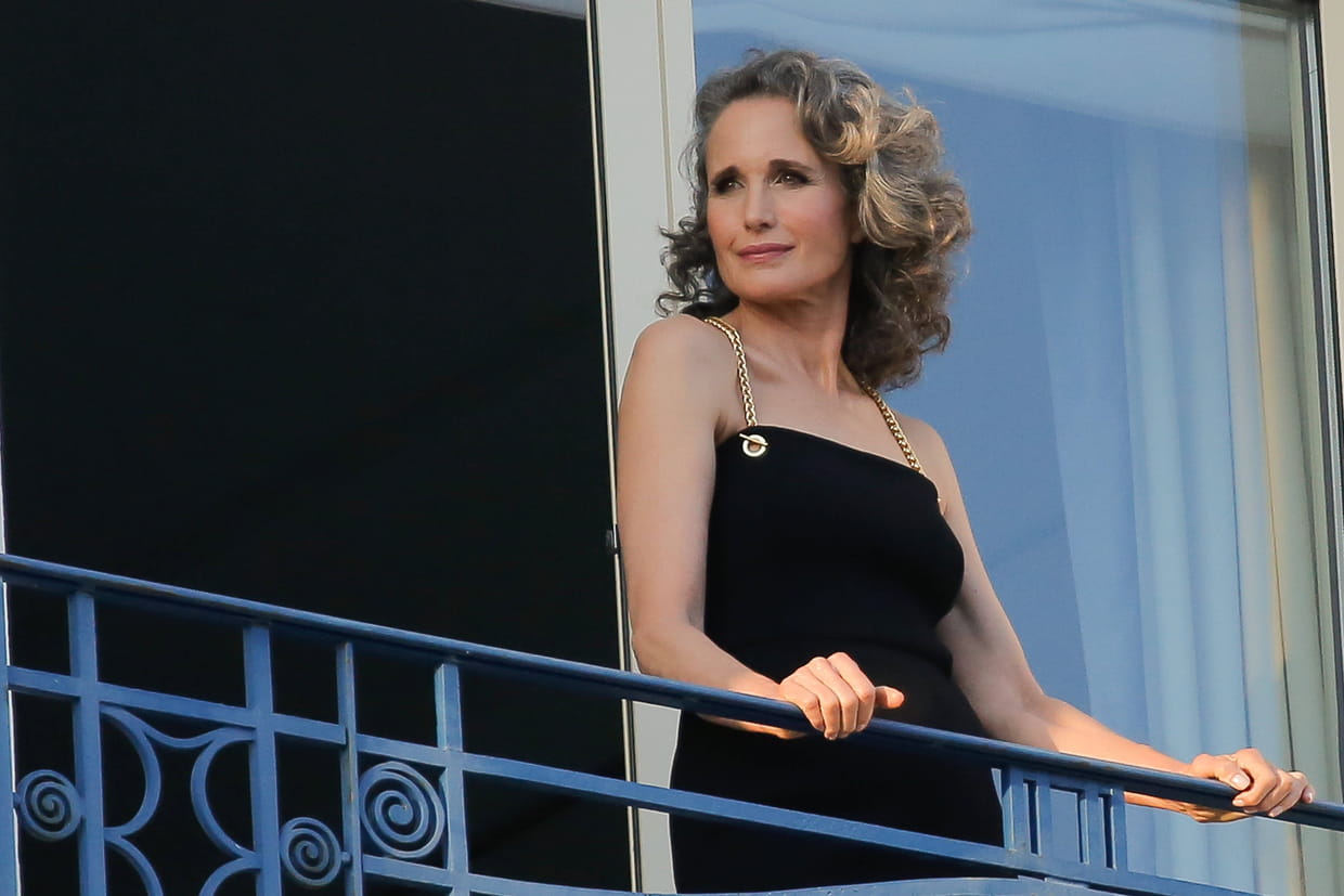 Andie MacDowell, devant l'hôtel Martinez le 25 mai