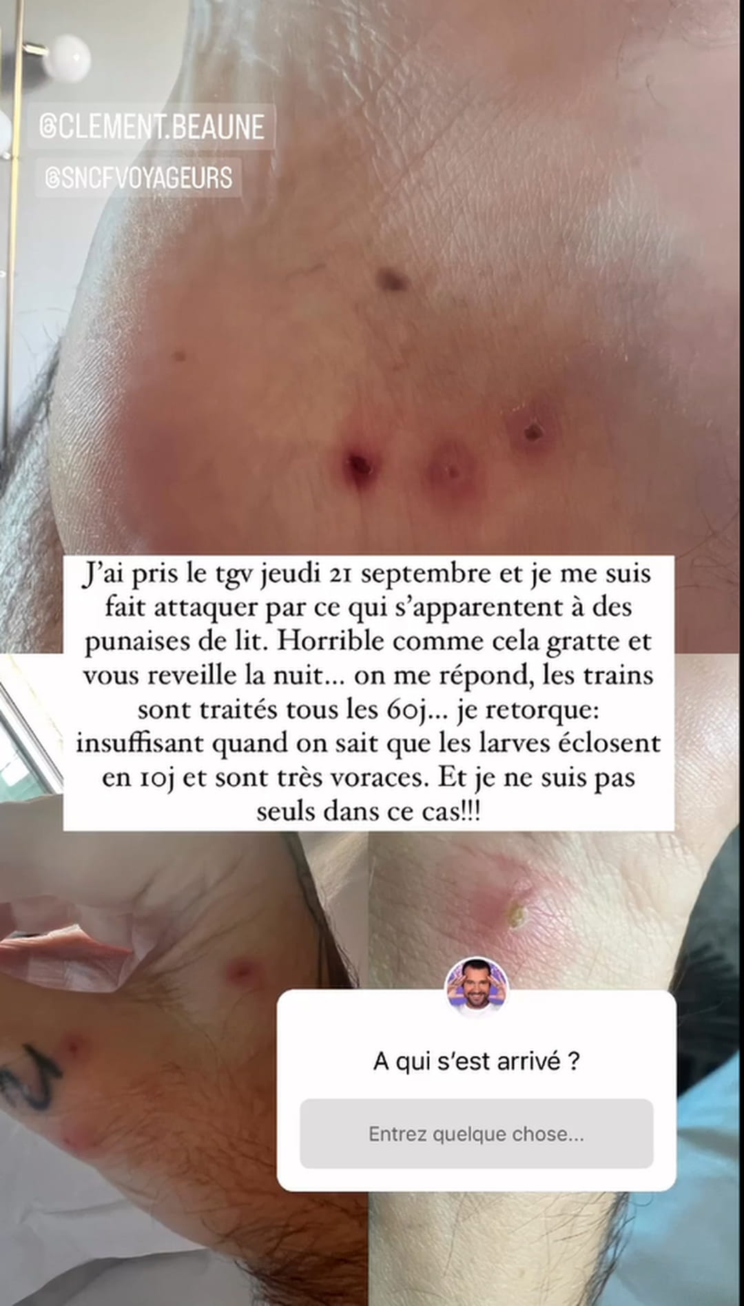 "J'ai pris le TGV le 21 septembre et je me suis fait attaquer par ce qui s'apparentent à des punaises de lit", écrit-il d'abord. Avant d'expliquer : "Horrible comme cela gratte et vous réveille la nuit".