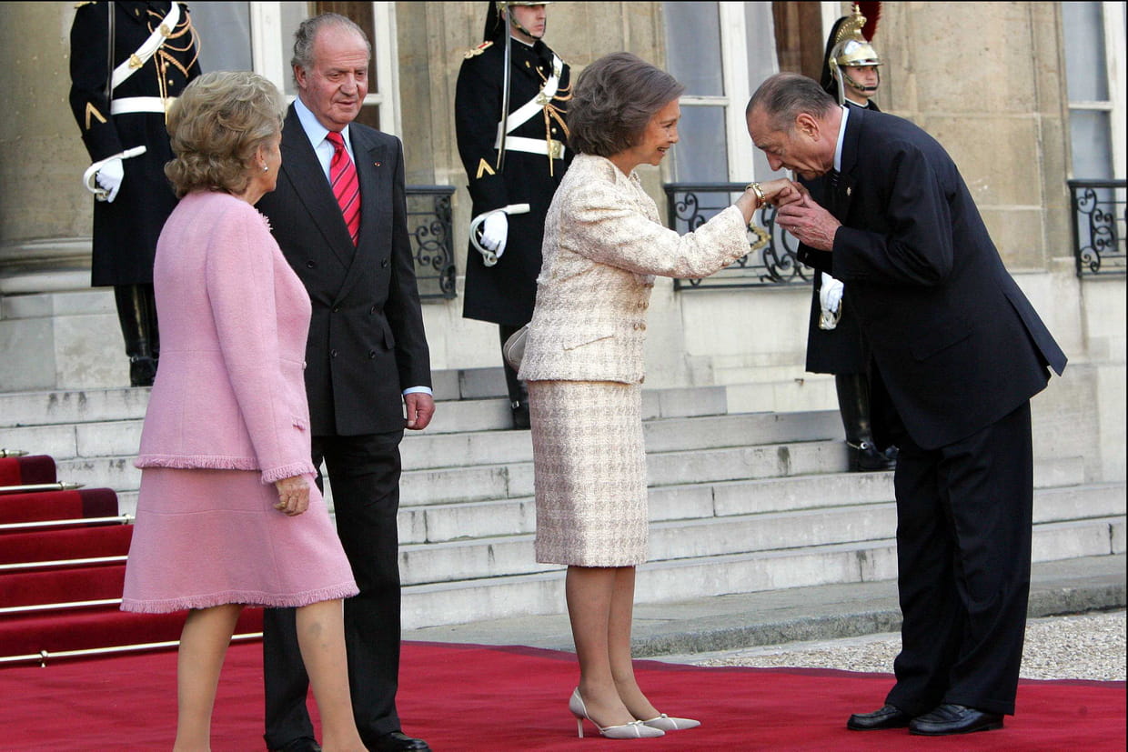 Jacques Chirac s'approprie avec joie le protocole en déposant un baiser sur la main de Son Altesse Royale Sofia d'Espagne, au nez et à la barbe de son mari, le roi Juan Carlos. Quelle audace !