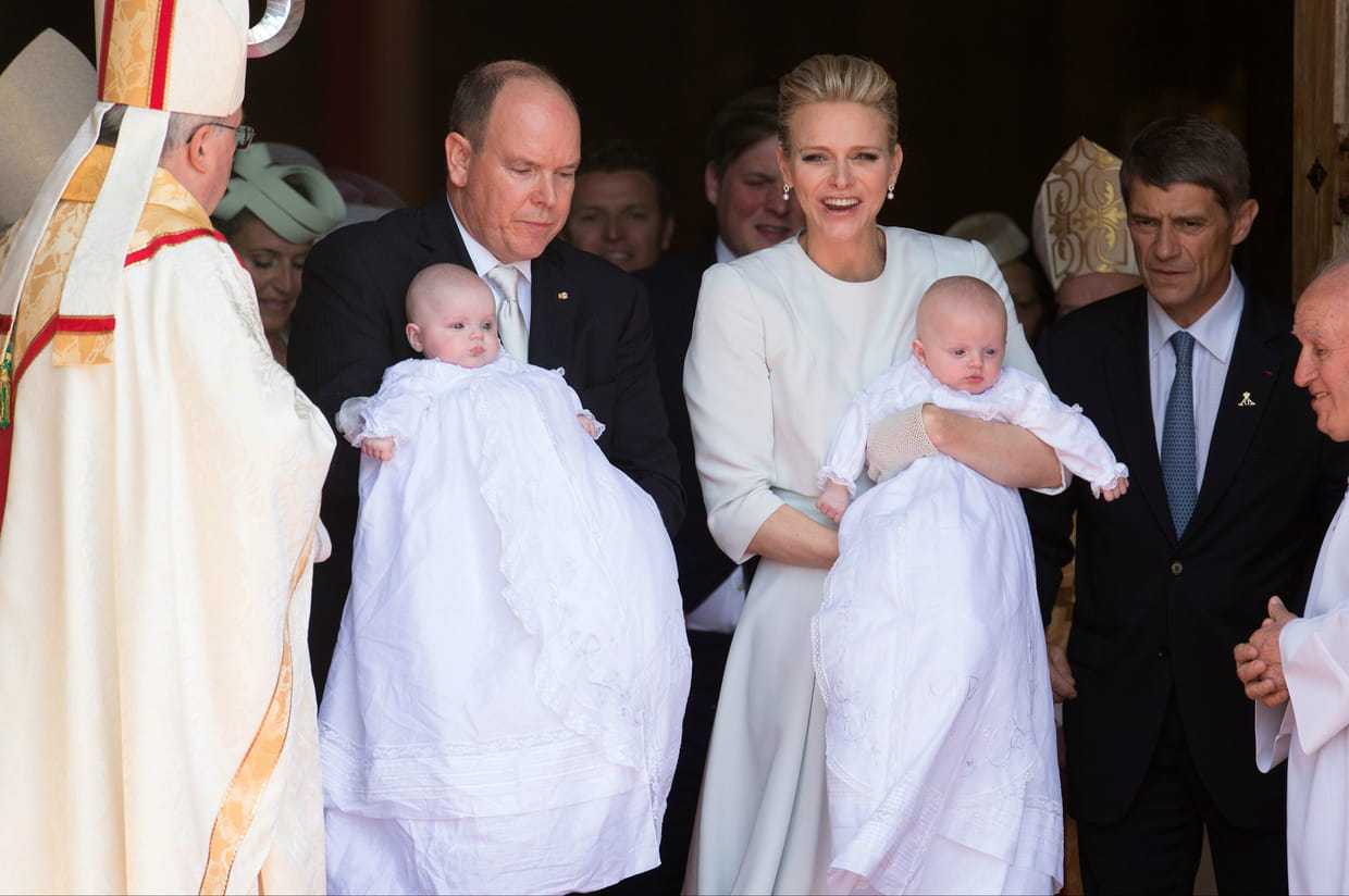Le Prince Albert II et sa femme Charlene portent les jumeaux Gabriella et Jacques dans leurs bras, lors du baptême de ces derniers le 10 mai 2015.