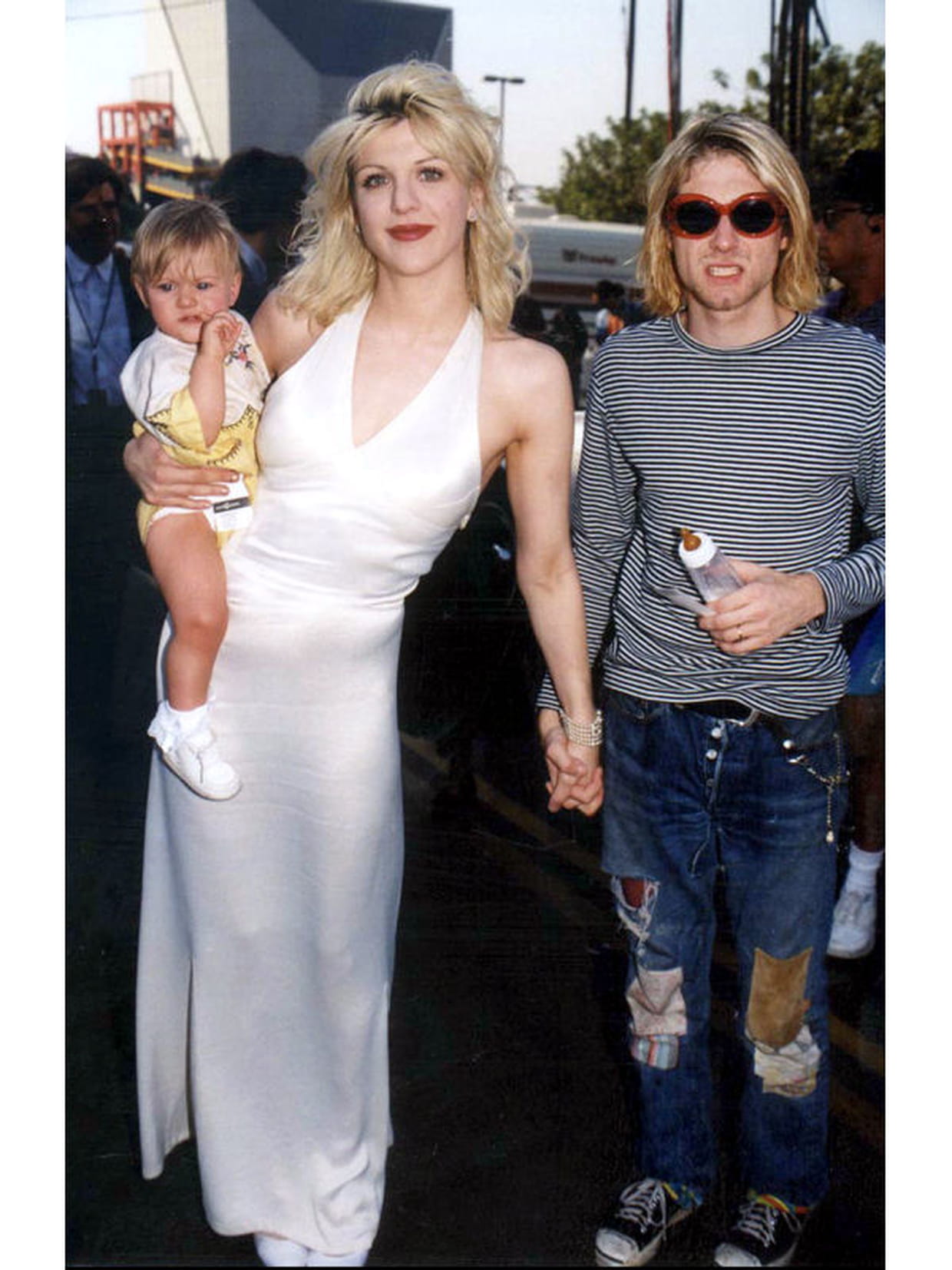 28/08/1993. Courtney Love, Kurt Cobain et leur fille Frances Bean, lors des MTV Video Music Awards à Los Angeles.