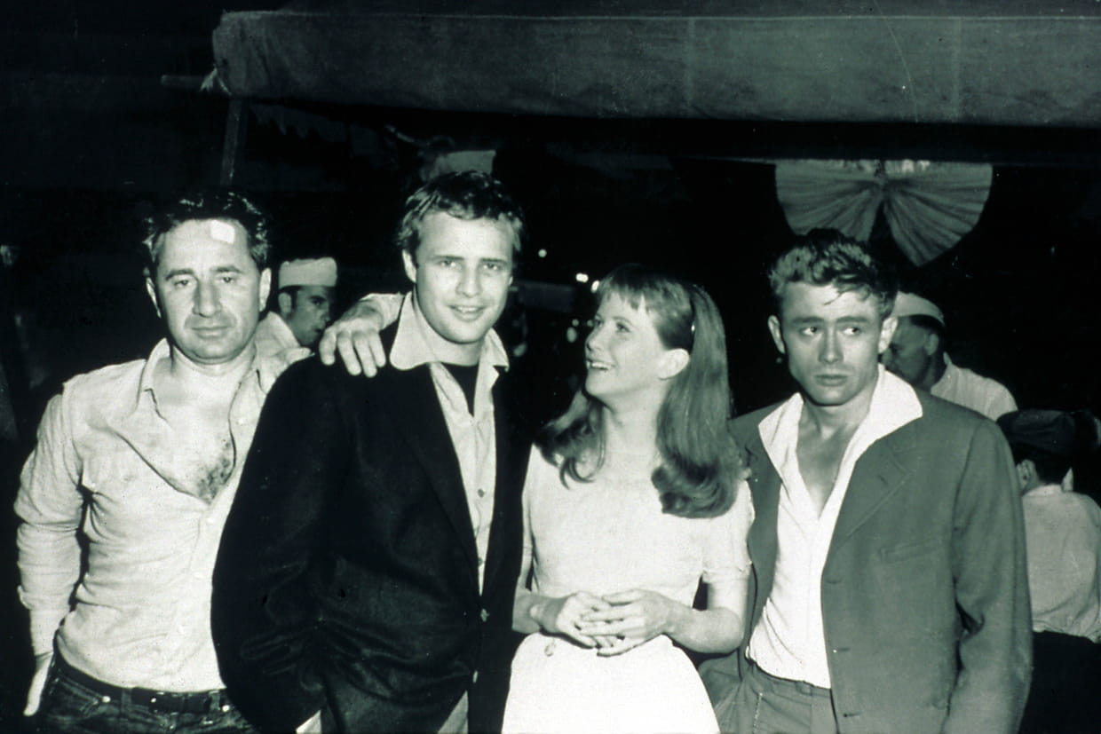 James Dean, entouré de Marlon Brando, Elia Kazan et Julie Harris, pour l'avant-première d'A l'est d'Eden en 1955.