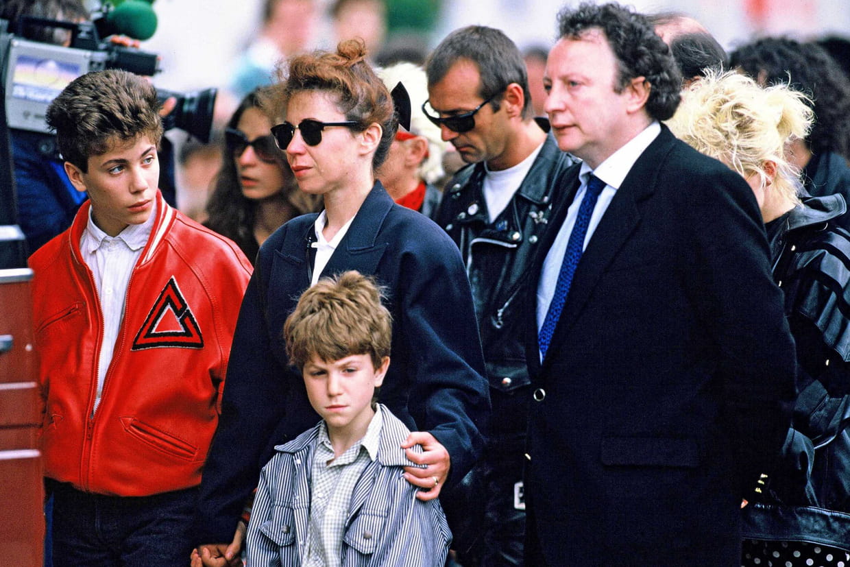 Véronique, son ex femme et leurs deux enfants, Romain et Marius, à l'enterrement de Coluche, le 24 juin 1986.