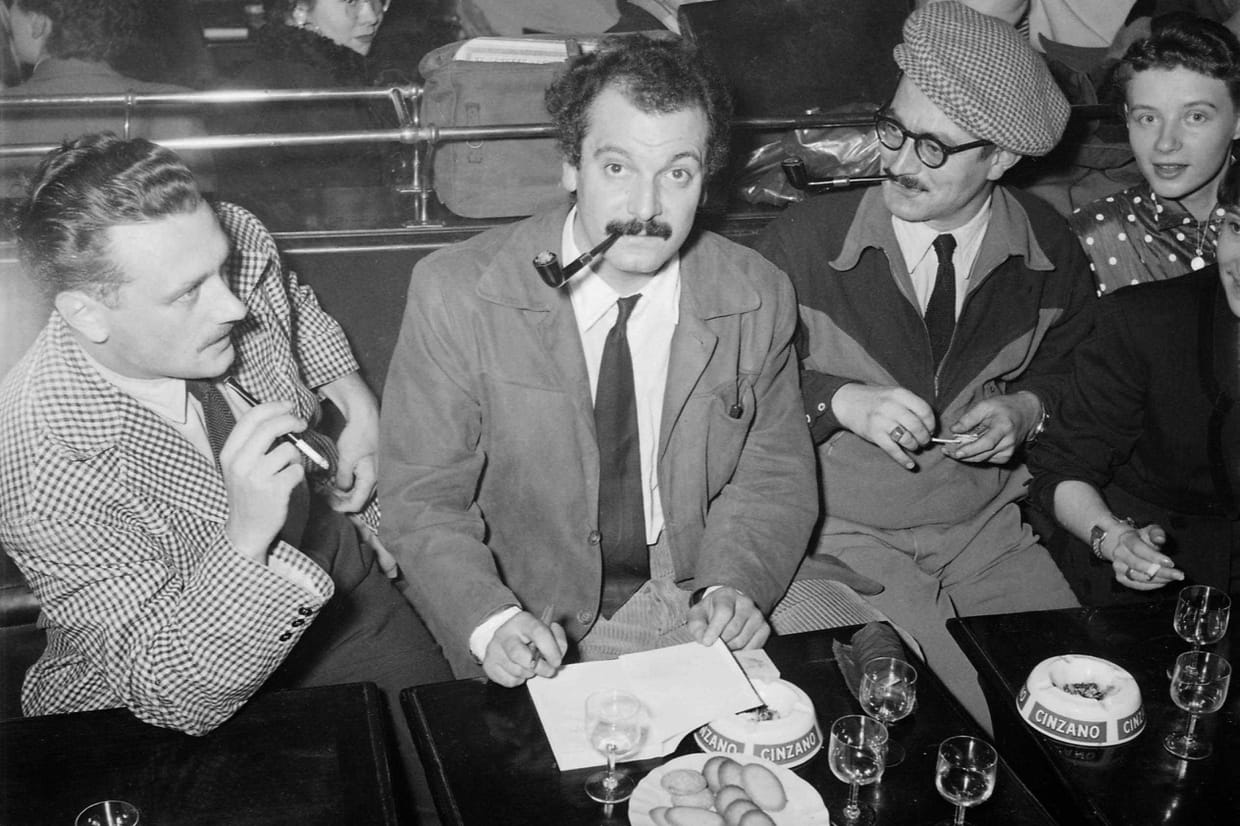 Georges Brassens signe des autographes en compagnie de son ami écrivain René Fallet. Le chanteur a joué et chanté dans le film Porte des Lilas, adaptation d'un livre de Fallet.