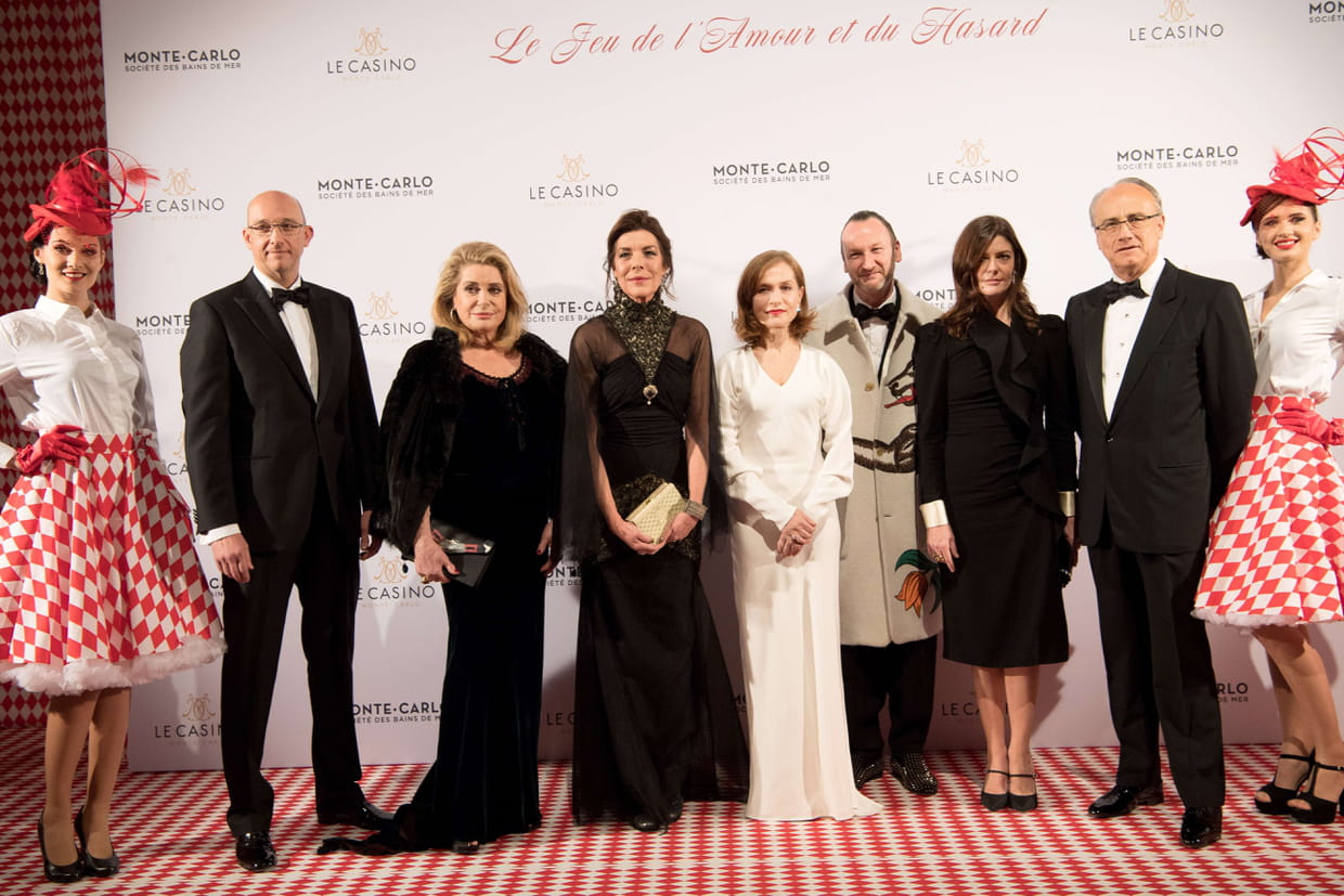 Pascal Camia, Catherine Deneuve, la princesse Caroline de Hanovre, Isabelle Huppert, Charles Kaisin, Chiara Mastroiani et Jean-Luc Biamonti posent aux côtés des hôtesses de la soirée.