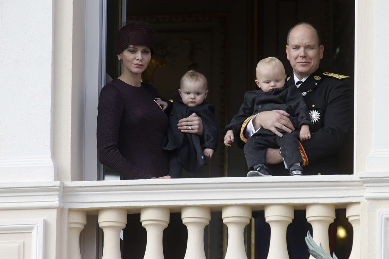 Le couple star de la Principauté salue la foule depuis la fenêtre de la résidence Grimaldi, avec les jumeaux Jacques et Gabriella, le 19 novembre 2015, lors de la Fête Nationale.