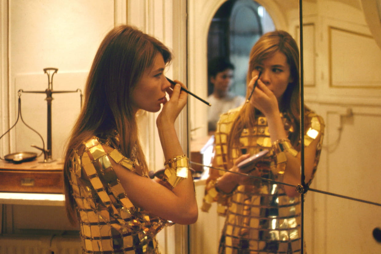 Petite retouche maquillage pour Françoise Hardy, dans une tenue scintillante, en 1968.