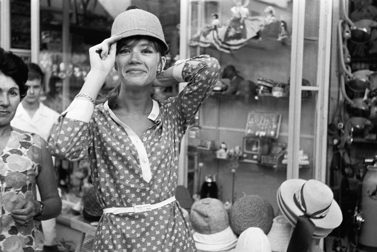 Françoise Hardy s'amuse en essayant des chapeaux à Saint-Tropez