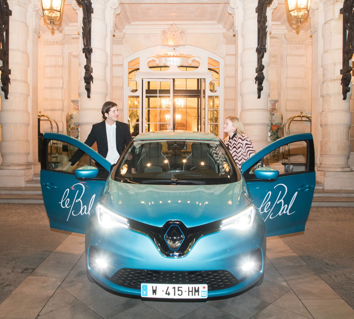 Josie Yates et Comte Rufus d'Hauteville arrivent au bal en voiture électrique Renault Zoé
