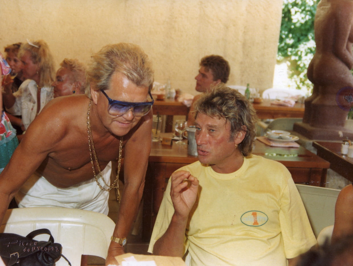 Johnny Hallyday et Michou se tapant la cloche à Saint-Tropez, le lieu de villégiature préféré de Michou