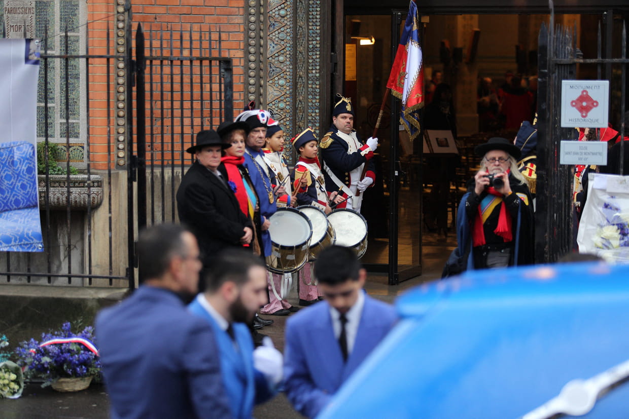 Le corbillard bleu-roi arrive devant l'église Saint-Jean de Montmartre