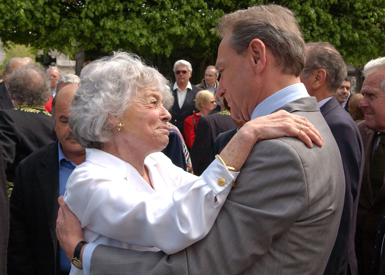 Claude Sarraute dans les bras de Bertrand Delanoë, aux obsèques de son mari Jean-François Revel