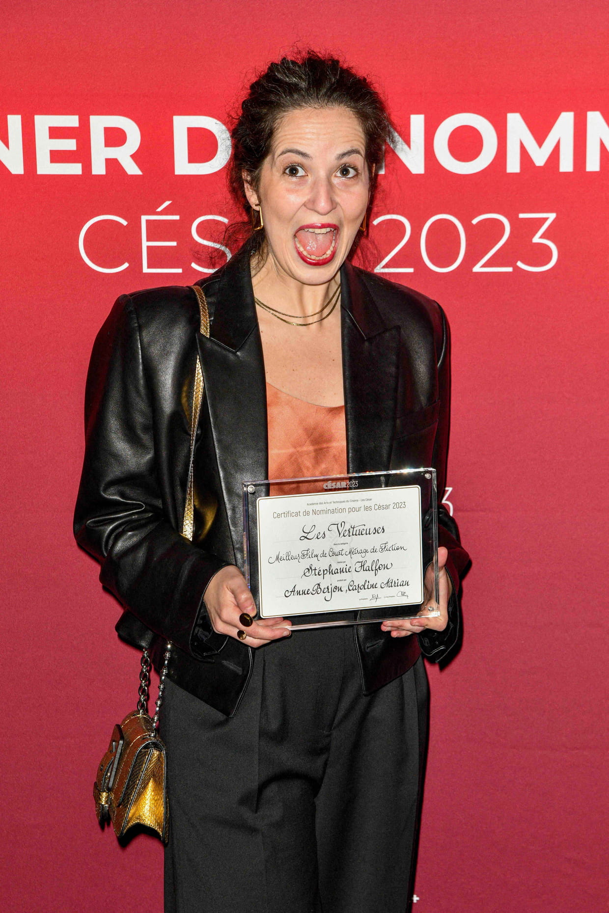 La réalisatrice Stéphanie Halfon bouche bée au dîner des nommés des César au Fouquet's