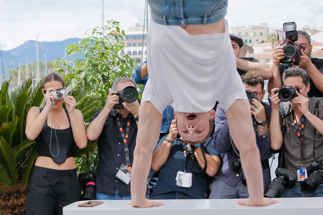Adèle Exarchopoulos s'est glissée dans la peau des paparazzi pour photographier l'impressionnante pirouette de Tom Mercier, lors du photocall du film Le Règne Animal.